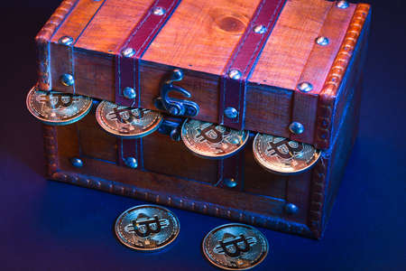 Wooden treasure chest with valuables, bitcoins, pennies or dollars isolated over dark background