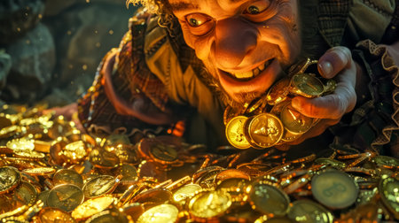 man dressed as a pirate stands before a gleaming pile of gold, his eyes wide with wonder and greed.
