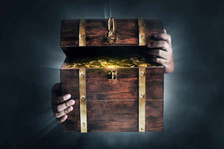 A wooden chest filled with gold coins. The coins are shiny and appear to be valuable. The chest is open, revealing the treasure inside