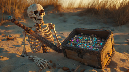 Pirate skeleton clutching a rusted sword beside an open treasure chest filled with sparkling gems on a sandy beach