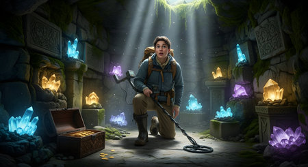 A young explorer with a metal detector looks on in amazement after discovering a treasure chest full of gold coins in a magical cave. The ancient stone ruins are illuminated by sunbeams and an array of glowing, colorful crystals, creating a scene of adventure and fantasy.