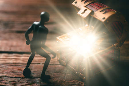 A treasure chest full of gold coins is opened, revealing a bright light shining on the coins. Concept of excitement and wonder, as if the treasure has been discovered after a long search