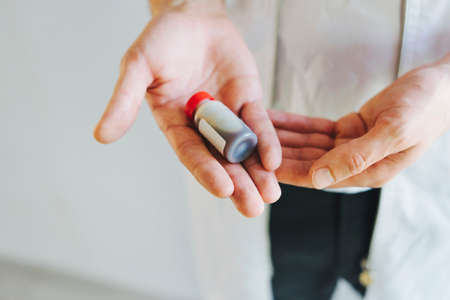 The doctor is holding a tube of medicine in his hand. Vaccine against the virus. Vaccine Covid-19. In the hands of a medical officer, the vaccine against the virus. The doctor is on the front line.
