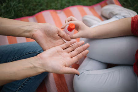 High angle view of hands with sanitizer gel. Close-up view of womans palms and childs hand holding sanitizer over mat and grass.