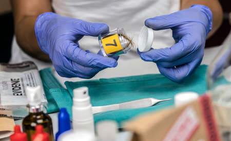 Specialist cop examines hair from crime scene, conceptual image
