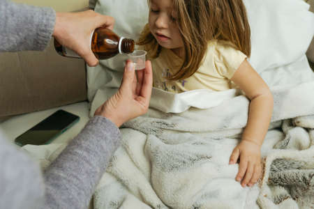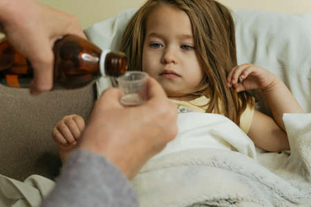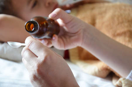 Female hands pour medicine for sick little girl