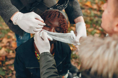 Two boys help a african girl in a autumn park