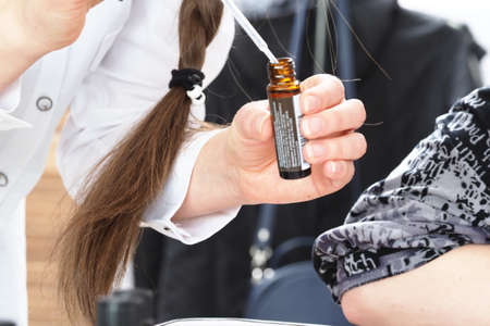 Beautician doctors hands put test tube with blood in centrifuge container. Rejuvenation plasmolifting procedure.