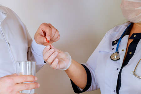 The pill in the doctors hands. Hands in medical gloves hold pill and glass of water. Medicine for the disease.
