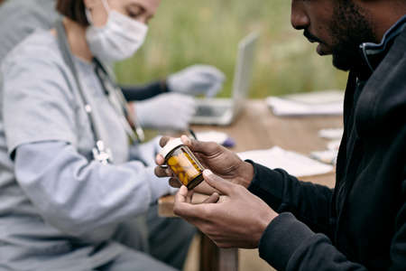 Closeup of therapist doctor hand giving pills bottle to african american sick patient discussing medication treatment during clinical appointment. Physician woman working in hospital office