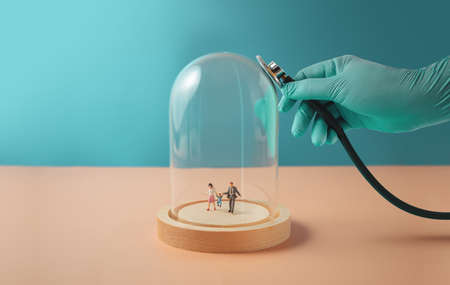 Health Care or Insurance during Coronavirus Concept. Hand of Doctor with Medical Glove Using a Medical Stethoscope to Check a Glass Dome. Miniature Figure of Family walking inside
