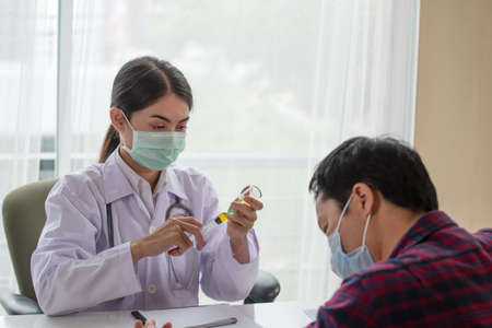 Doctor consulting with patient examining for using medicine, presenting results symptom about the problem and recommend treatment method, Healthcare and medical concept.