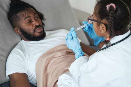 Nose swab for testing closeup. Unknown doctor hands taking medical sample. Sick african american patient with oxygen mask undergo therapy in infectious clinic.