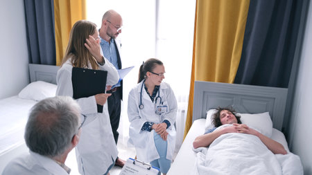 A group of interns stands around the bed where the patient is lying. Doctors discuss the young man's condition and methods of treating his illness. The concept of medicine and healthcare