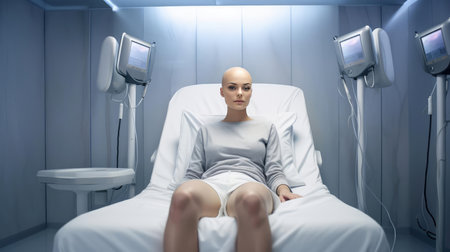 Woman with no hair on her head on bed in hospital