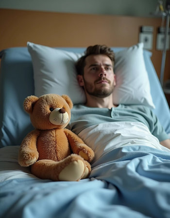 In a serene hospital room, a man lies in bed, contemplating his recovery. Beside him sits his faithful teddy bear, symbolizing hope and companionship in challenging times.