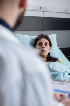 Closeup of sick woman with nasal oxygen tube resting in bed. Patient discussing with practitioner doctor about medical healdcare expertise checking disease test results working in hospital ward