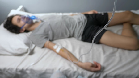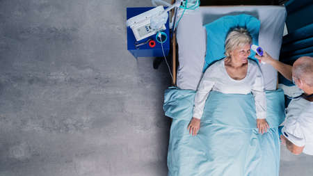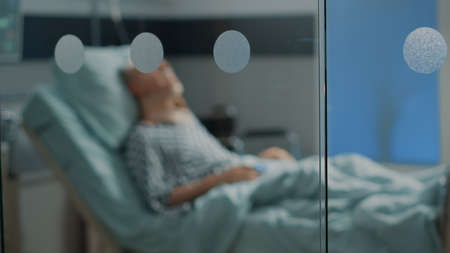 blurred background. man with oxygen mask and dropper on hospital bed