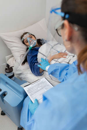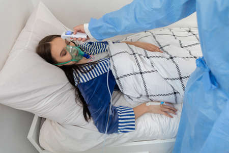 Patient temperature measurement. Young teenager. Oxygen mask on the face. Hospital bed in an infectious ward.
