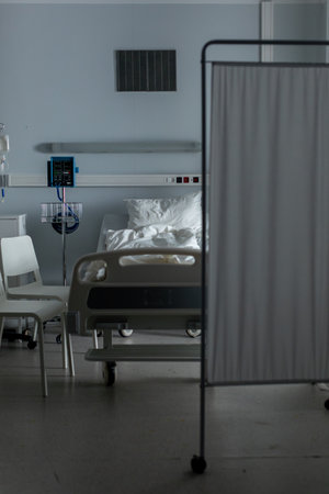 Interior of a hospital ward with empty bed and sickbeds