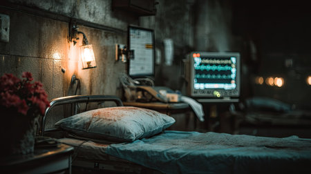 A hospital room is depicted with a bed, medical equipment, and sunlight streaming through the...
