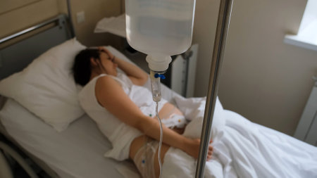 A female patient resting in a hospital bed with medical devices nearby.