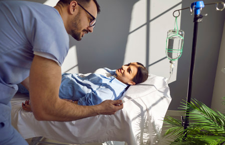 Sick young female patient lying on the couch in hospital receiving IV drip infusion. Young nurse or doctor help woman patient with vitamin injection therapy in medical clinic. Health care concept.