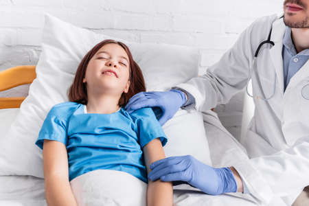 pediatrician examining diseased girl lying in bed with closed eyes