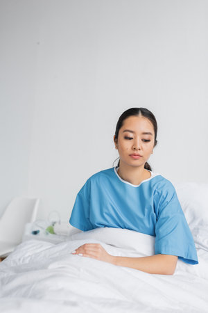 depressed asian woman in hospital gown thinking while sitting on bed in clinic