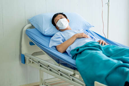 Covid-19 infected patient with face mask lie on bed in restrict closed room in the hospital and he look tire and sad need encouragement from the other.