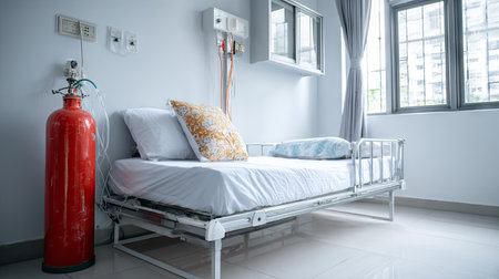 A clean hospital room featuring an empty bed and an oxygen cylinder, representing a tranquil and safe healthcare environment ideal for patient care.
