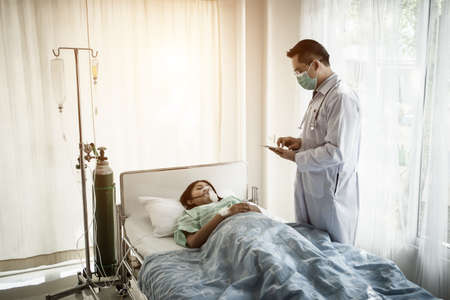 Women Asian doctors hold the patient hand and encourage and provide medical advice While checking the patient health in bed. Concept of Care and compassion, antenatal care, Threatened abortion
