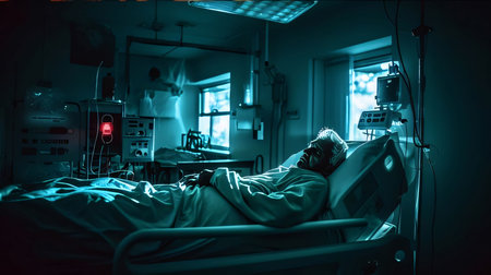 Hospital and doctors help: Sick patient lying on bed in hospital ward at night. Health care concept.