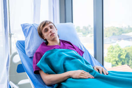 One a man patient With anxiety face lying on bed in the room hospital background.