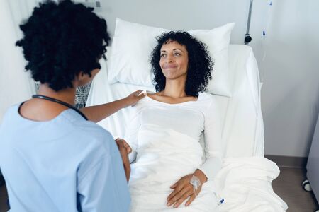 Front view of African-American female doctor consoling female patient in the ward at hospital