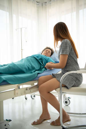 Daughter of a senior patient taking care and encouraging the mother after receiving treatment from the doctor.