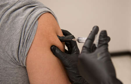 Close-up of doctor's hands in protective medical gloves, injecting a vaccine to volunteer. Unrecognizable patient vaccinated against virus or viral infectious diseases. Clinical research, trial
