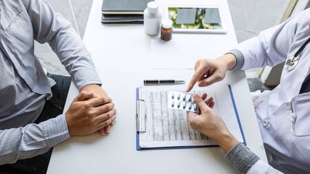 Visiting a doctor concept A physician suggesting his patient to take capsule for treatment and explaining how to take them