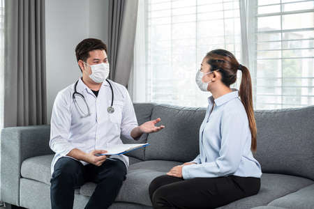 Man doctor in medical face mask holding clipboard to discussion about symptoms and disease after using stethoscope with patient and giving advice treatment for her during medical help at home