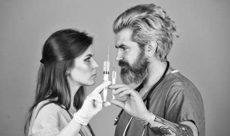 Physician give remedy against virus. epidemic from china. selective focus. nurse and doctor use syringe. health worker make injection. hpv vaccine in syringe