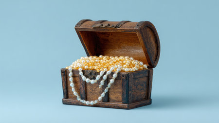 Captivating image of a vintage wooden chest overflowing with elegant strings of pearls set against a soft blue background, symbolizing luxury and timeless beauty. Perfect for various creative projects.