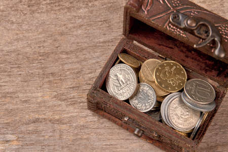 A vintage wooden chest filled with assorted coins, showcasing a mix of textures and metallic finishes, set against a dark, moody background.