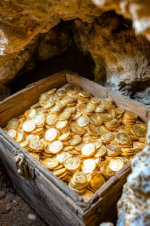 A rustic wooden treasure chest overflowing with shimmering gold coins sits in a dimly lit cave, creating an atmosphere of mystery and adventure within nature's hidden gems.
