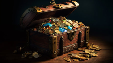 A wooden box filled with gold coins. The coins are of different sizes and shapes, and they are all shiny and golden. The box is open, revealing the treasure inside. Concept of wealth and abundance
