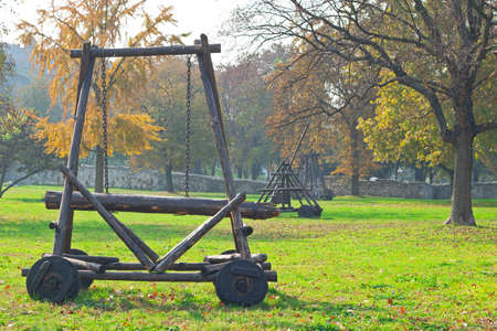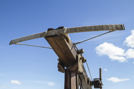 old wooden catapult, ancient combat weapon