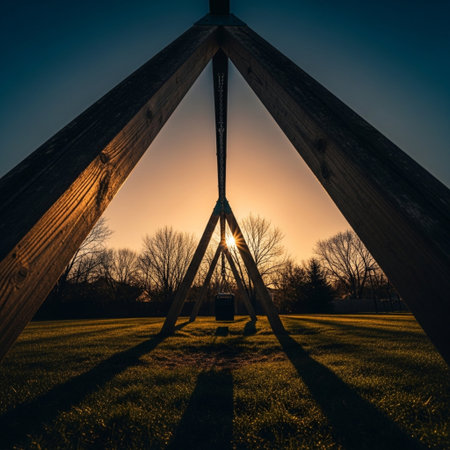 Weathered wooden swing set moving gently in a cool breeze under harsh sunlight. Low angle, cinematic