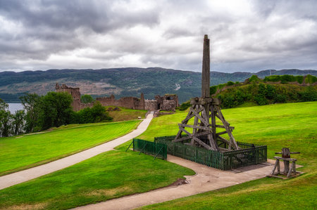Urquhart Castle and Catapult. Loch Ness, Drumnadrochit, Inverness, Scotland, United Kingdom.