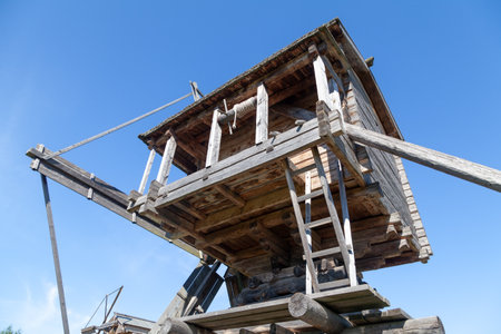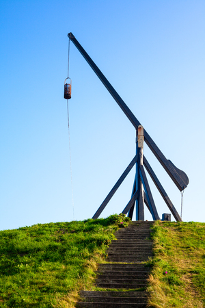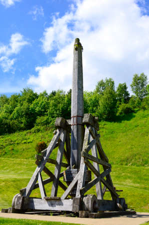Historical reconstruction of the full size catapult layout in the historic architectural park. Old wooden Scandinavian medieval fortress