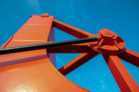 Business and commerce. Cranes at port area, lifting block, cargo container yard. Industrial detail, part of heavy machinery