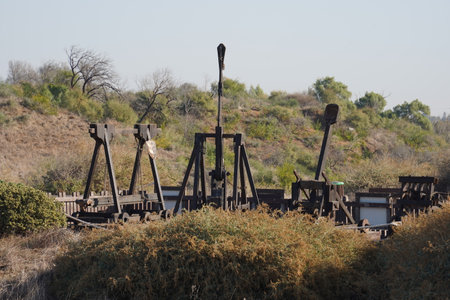 Siege machines, catapult, siege ram, trebuchet, stone bombs Apollonia crusader castle near Herzliya Israel on the Mediterranean coast